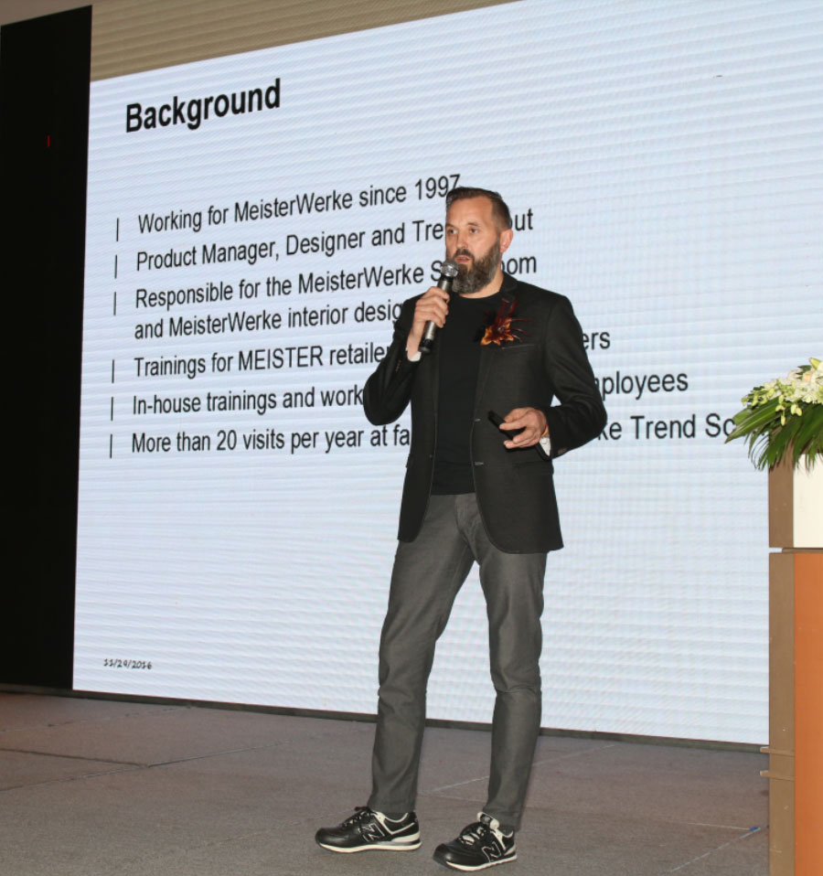 本屆必美設計師精英沙龍的主題為“德國設計大師分享歐洲流行色彩趨勢”。現場邀請到了德國工業設計大師Mr. Karsten Herting卡斯騰.海頓先生作為主講嘉賓。Mr. Karsten Herting卡斯騰.海頓先生在工業設計領域十分出色,尤其在產品表面的研發方面有獨特天賦,對于色彩的運用也非常有見解。在2015年,他獲得了Design Borden室內設計革新獎;另外,他還是必美德國舒爾特地板三項紅點設計大獎的設計師,2009年,他所設計的SP400以及SP300地板均獲得了紅點獎。