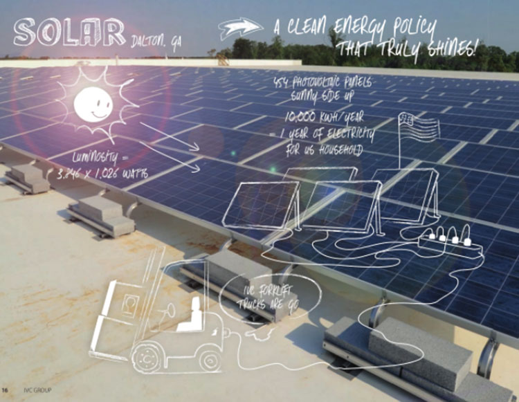 2012年,IVC的環境管理體系獲得ISO14001認證。2014年,IVC建造的3座風車風電場全面運作,每年為工廠提供1/3以上的能源支持。位于美國的一個IVC工廠,由454塊太陽能電池板打造而成的光伏花園每年能夠產出超過1000千瓦時總和的電量,這是1個美國家庭1年的用電量,工廠的整體排放水平低于行業水平的250%。IVC的斯海爾德河工程淘汰了80%的機械冷卻系統,這些冷卻系統使用的是不環保的冷卻劑。此外,IVC采用管端技術和嚴格的監控程序,重新利用回收資源,回收裝置捆綁了各類廢物的回收系統,每年能讓17500噸垃圾實現回收再利用。在地板行業的嚴格排放標準中,IVC地板遠低于所公布的270種潛在有害物質黑名單的排放標準,獲得過德國藍天使、法國A+等多項國際性環保認證,產品均遵循德國AgBB標準(世界上高度嚴格的空氣質量標準)。