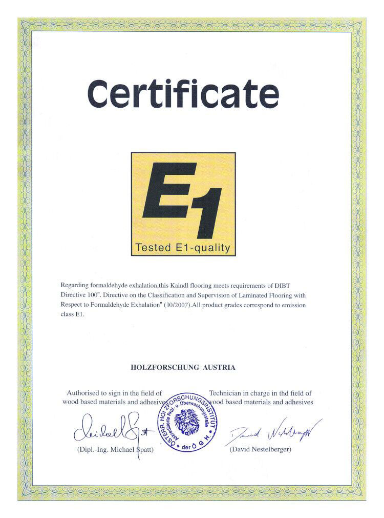 歐洲國家根據(jù)人造板中游離甲醛含量來劃分等級,目前歐洲甲醛限量等級被分成E1、E2、E3,它的標(biāo)準(zhǔn)具體體現(xiàn)在數(shù)值上,必美代理的歐洲原裝進(jìn)口地板獲得的E1級認(rèn)證表明產(chǎn)品的甲醛釋放量非常低,是地板高度環(huán)保的證明。