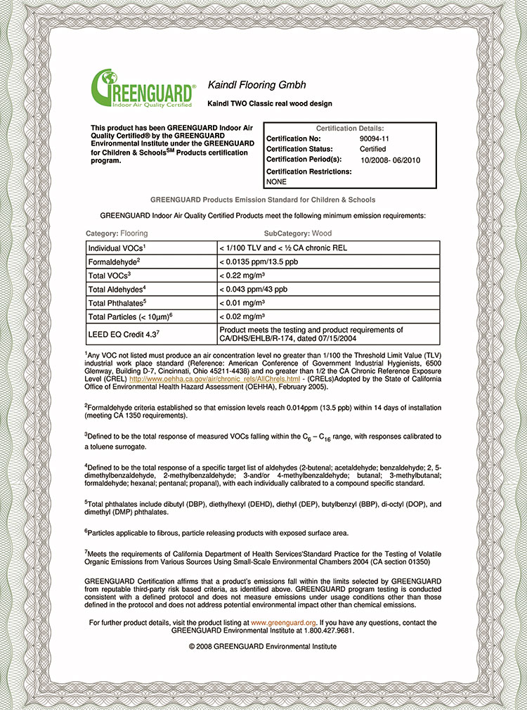 GREENGUARD室內(nèi)空氣質(zhì)量認(rèn)證是針對室內(nèi)材料、家具以及構(gòu)造系統(tǒng)的低揮發(fā)產(chǎn)品的認(rèn)證項(xiàng)目。檢測方法依據(jù)GREENGUARD的“動態(tài)環(huán)境控制艙內(nèi)檢測化學(xué)揮發(fā)方法”的檢測方法,所有產(chǎn)品將在動態(tài)環(huán)境控制艙內(nèi)被檢測。通過對75,000多種不同行業(yè)的產(chǎn)品進(jìn)行化學(xué)物質(zhì)排放檢測研究,能夠確認(rèn)釋放到空氣中的12,000多種揮發(fā)性有機(jī)化合物,從而保證室內(nèi)空氣質(zhì)量。獲得GREENGUARD認(rèn)證的產(chǎn)品,也證明通過了世界上權(quán)威的室內(nèi)空氣質(zhì)量認(rèn)證測試。