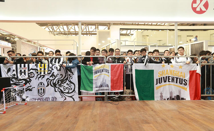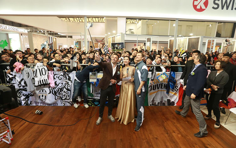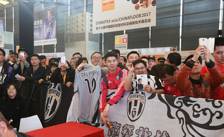 下午,E1館A01必美地板展廳,球迷見面會在全場高唱尤文圖斯隊歌時正式開始!皮耶羅一身颯爽英姿,帥氣地與球迷問好!