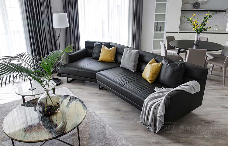客餐廳沒有過多瑣碎的家具,大體量轉角沙發安置在梁體下方弱化大梁的存在,以圍合形式拉近家人間的距離。