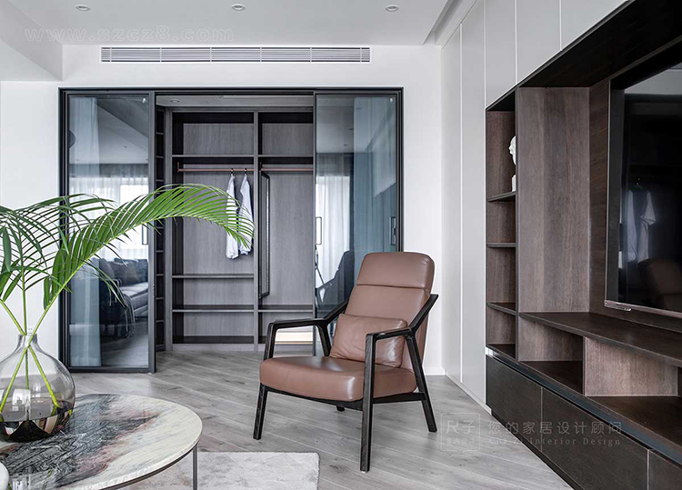 異形角落改造為實用的收納空間,以玻璃推拉門與客廳相隔,既不妨礙主空間的通透性,也能修正戶型的不方正感。