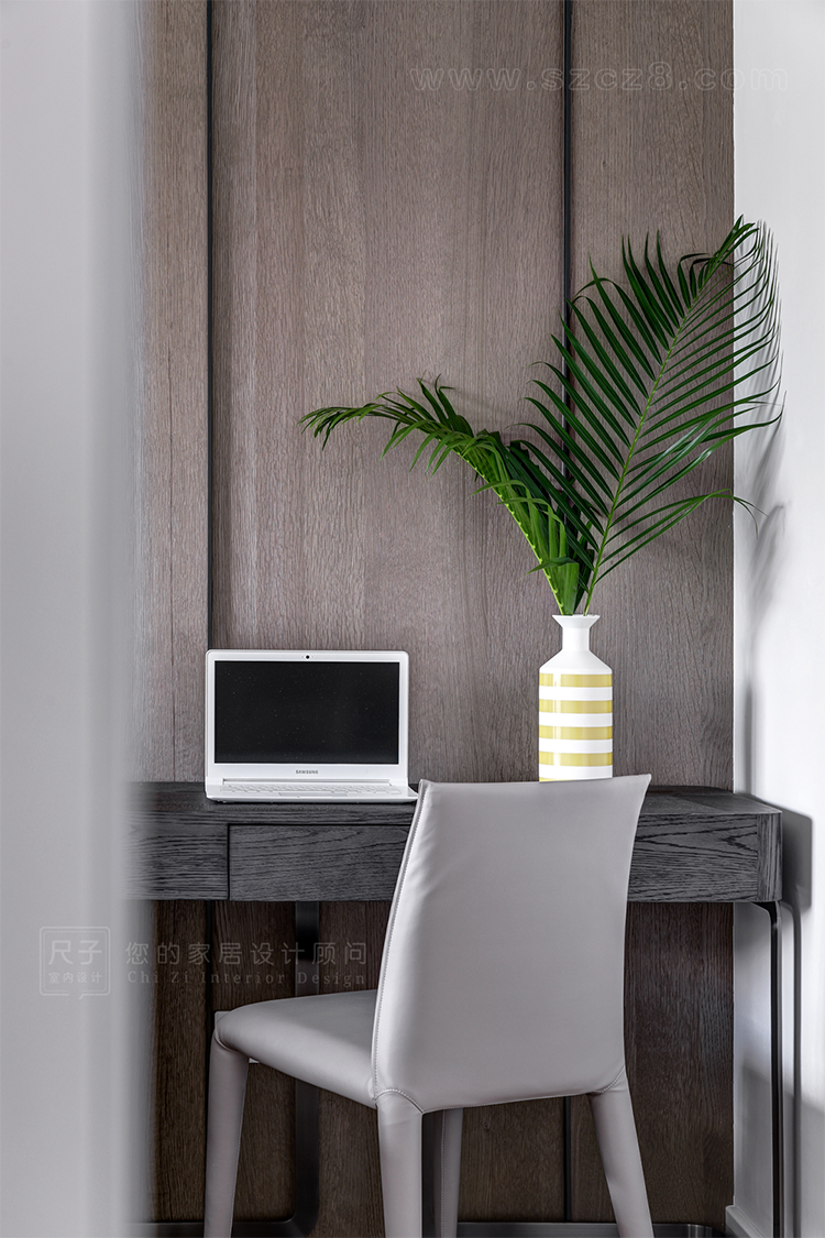 灰白搭配延展出更開闊的視覺表現,局部深色的運用讓居室彰顯內斂安定的質感,再加以咖色、黃色作為點綴,營造出一種隨意輕松的居住氛圍。