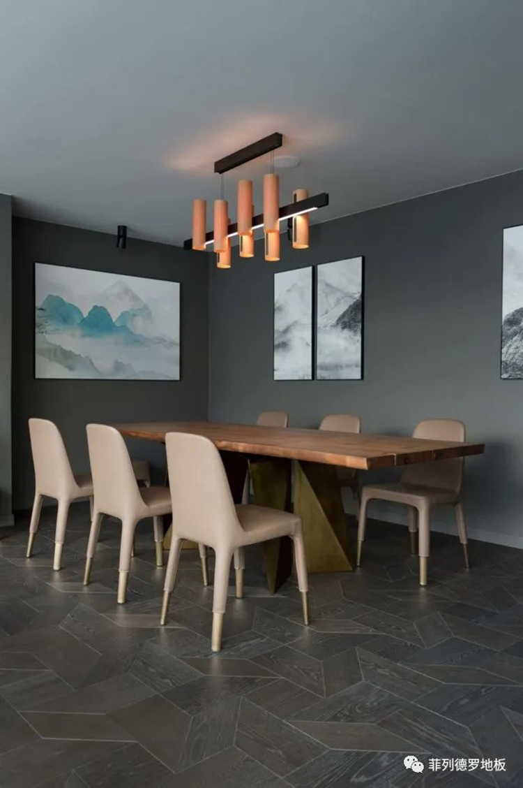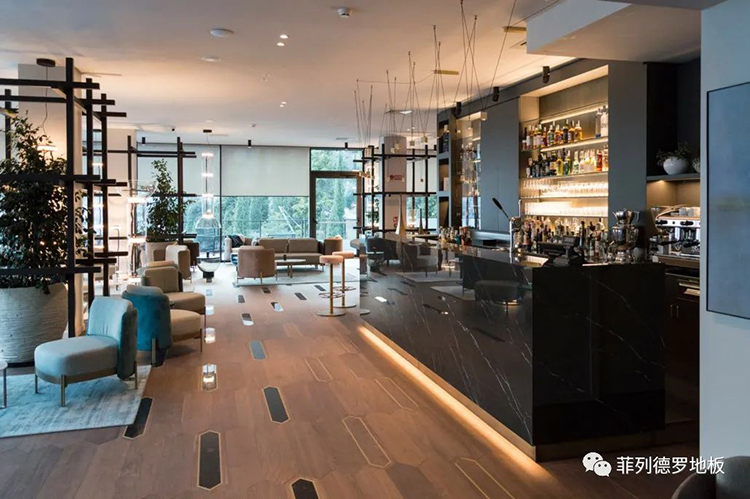 在精致的湖景酒吧中,Tricot模塊地板的Ca' Melli花色,創造出令人印象深刻的幾何構圖。煙熏橡木的色調營造出愉快的明暗對比,給地板表面和房間賦予活力和個性。