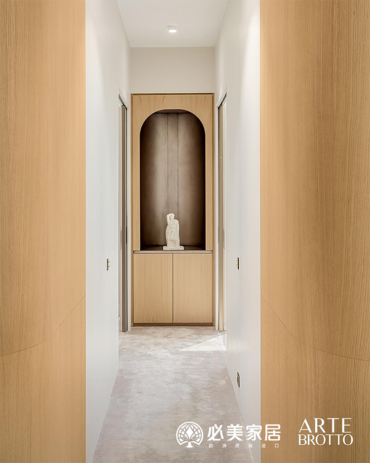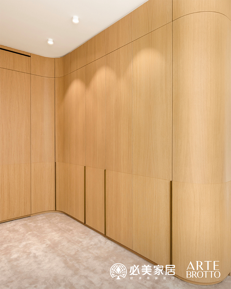 比如走廊上的這個壁龕櫥柜,采用了拉絲陰影覆蓋的天然橡木,這表明阿特·布魯托家具對細節(jié)的一絲不茍。這一特殊項目的獨特之處也體現(xiàn)在這一細節(jié)上:體現(xiàn)永恒優(yōu)雅的曲線。