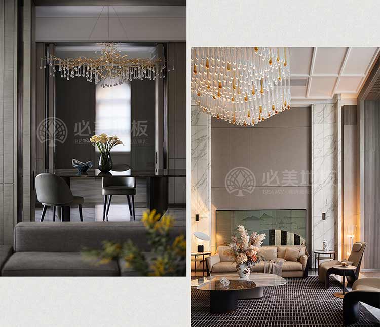 步入會客廳,大面積的灰色影木,色淡高雅,無形之中把千變萬化的自然紋理呈現于世,木紋如絲綢,褶皺如山脈,溫柔起伏,渾然天成,勾勒出雍容華貴的基底。