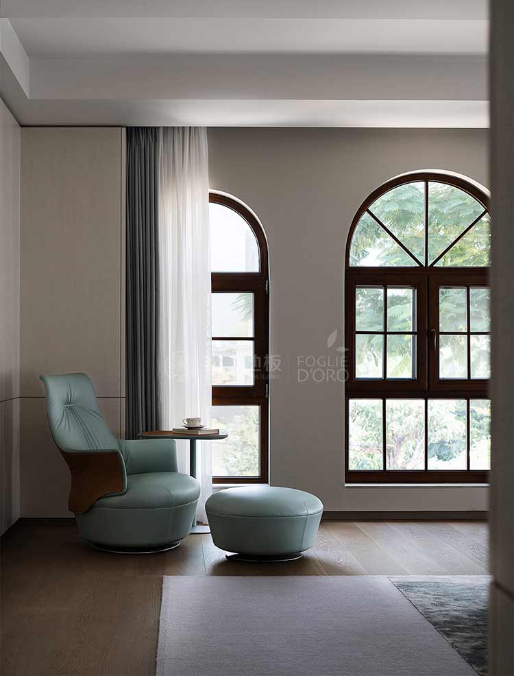 設計在休憩空間更為克制,整體質感的體現通過細節的雕琢來呈現。大面的低飽和設色,給人以靜謐放松的空間感受;張弛有度的線條浸入其中,詮釋居住的美學范式;奢適的尺度容納生活需求,大開窗將光與景的變化全盤收藏。無論是從美學還是功能角度來看,必美菲列德羅巴塞吉奧木地板都是這個空間不可或缺的一部分。