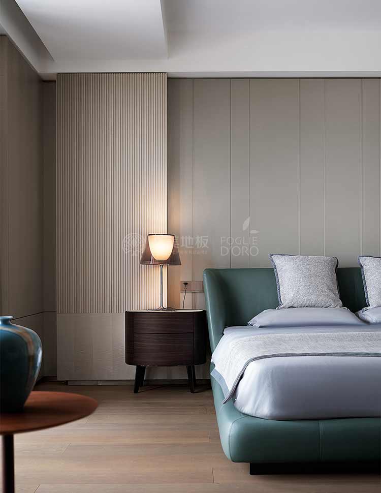 基于空間場景的整體打造,臥室的功能不僅僅考慮居住功能,設計希望臥室也可以像酒店套房一樣成為可以自在休憩的空間。在這間臥室的設計中,必美菲列德羅巴塞吉奧橡木地板成為整個空間的焦點。