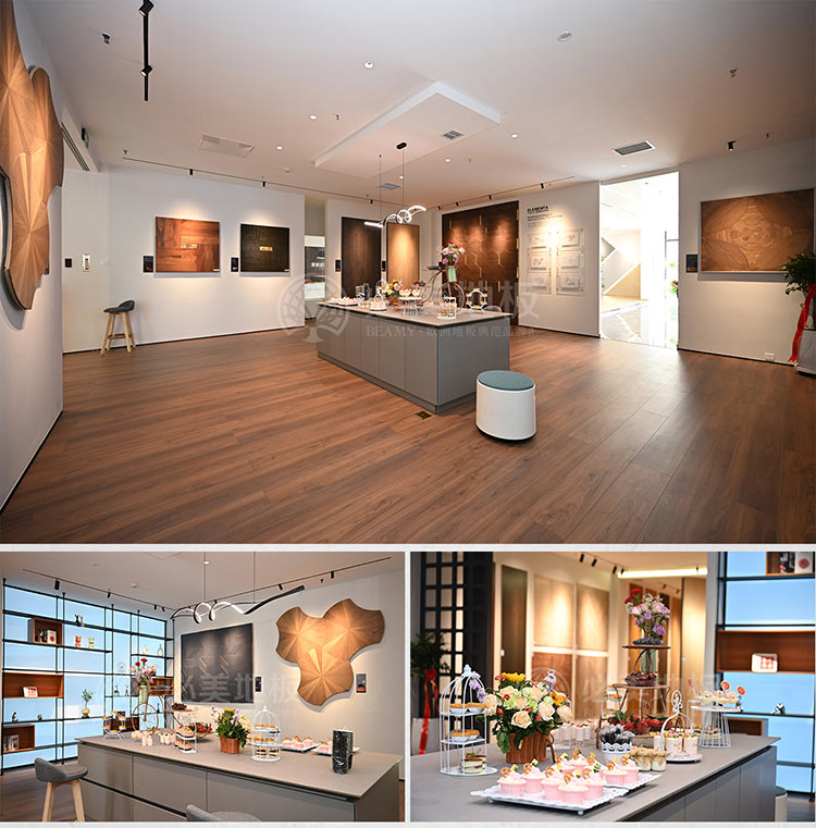 整個長春必美地板旗艦店中,旨在給消費者創造一種全新的消費體驗,融合了經典、臻奢、健康、自然、藝術,是一個有維度,有溫度的品質品牌。歐洲文化對木地板制造藝術的專注和高度的人文關懷被表現得巨細無遺,精練、恒久又自然。