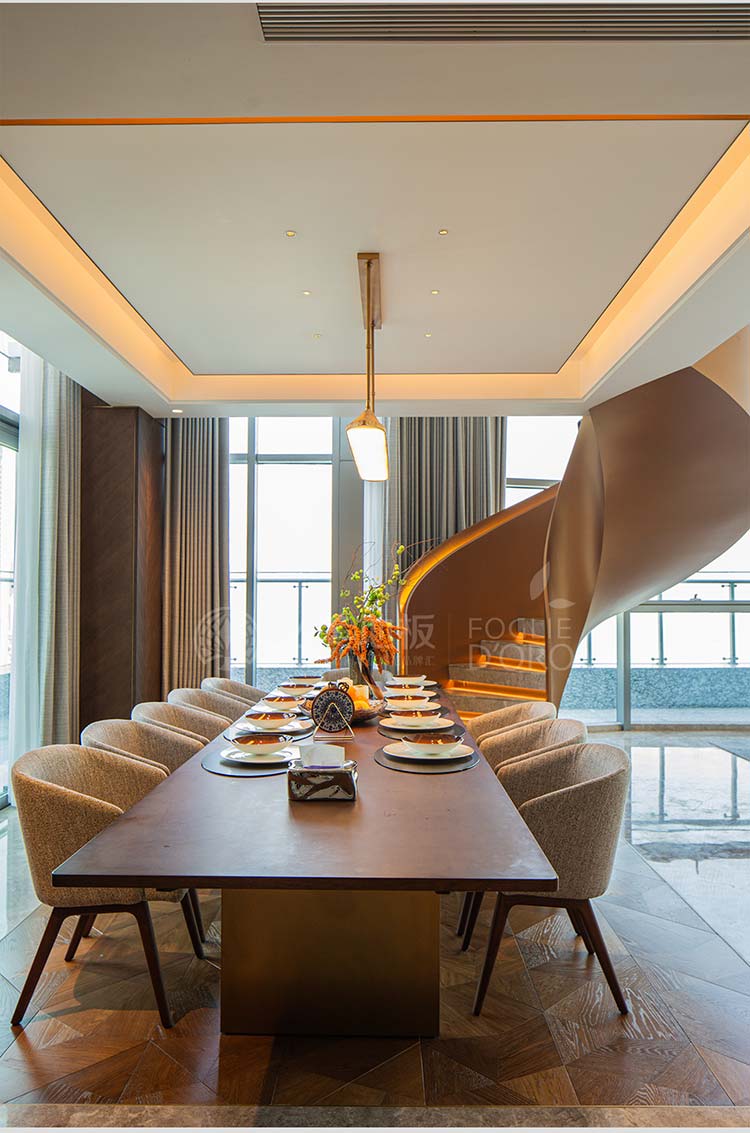 流暢的曲線在光影中交織,將居者的目光與思緒自然引向更廣闊的上方空間。其選材之考究,工藝之繁復,無不彰顯著對極致的苛求,預示著整個空間非凡品位的序幕已然拉開!