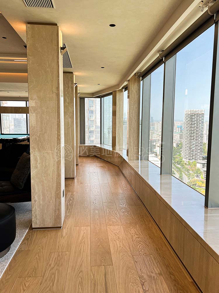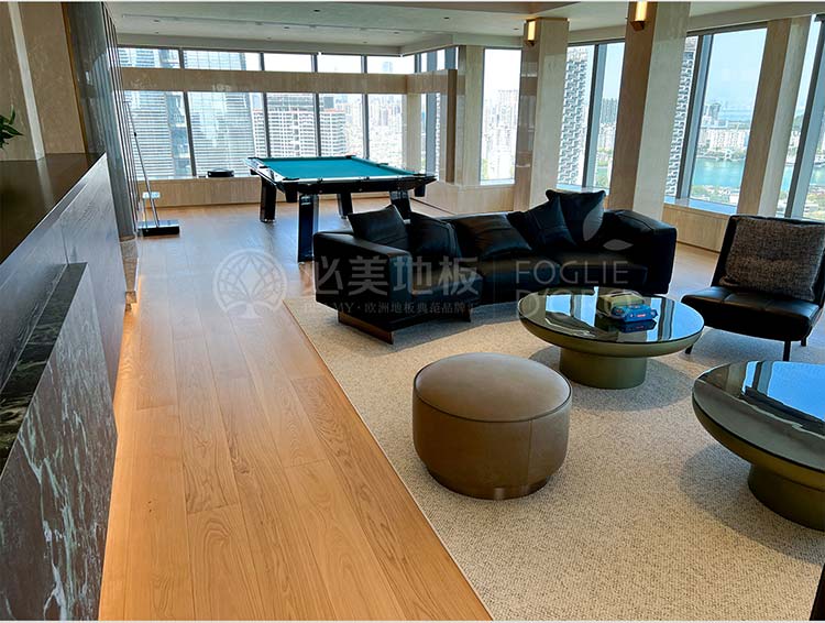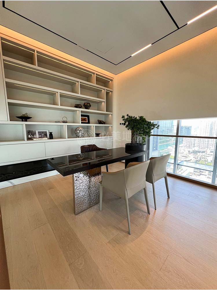 從旋轉樓梯的藝術焦點,到餐客廳弗拉門蒂拼花的幾何動態節奏;從茶室碧昂佳橡木的溫潤禪意,到次臥巴薩諾直板的寧靜舒適;從主臥巴塞吉奧橡木的尊貴沉穩,再到私人會所巴薩諾直板的活力溫吞……在這座深圳灣頂奢復式別墅中,每一塊必美地板都絕非簡單的地面鋪裝,而是經過深思熟慮的空間靈魂塑造者。它們以不同的個性,共同譜寫出一曲關于自然、藝術、奢華與生活的和諧交響。