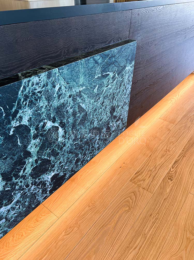 必美菲列德羅巴薩諾直板地板在整個空間的應用,低調優雅的外觀,通過拉絲、染色、清漆等手工制作的加工,增強了木材的自然特性,由經驗豐富的25年以上的威尼斯工匠以手工拼裝,經千錘百煉令品質完美無瑕。