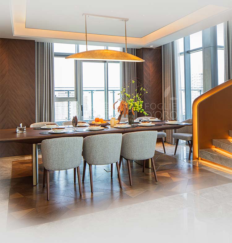 在餐廳區域地面鋪裝的選擇,是奠定整個空間氣質的關鍵。甄選了來自意大利必美菲列德羅Foglie d’Oro的弗拉門蒂拼花地板。