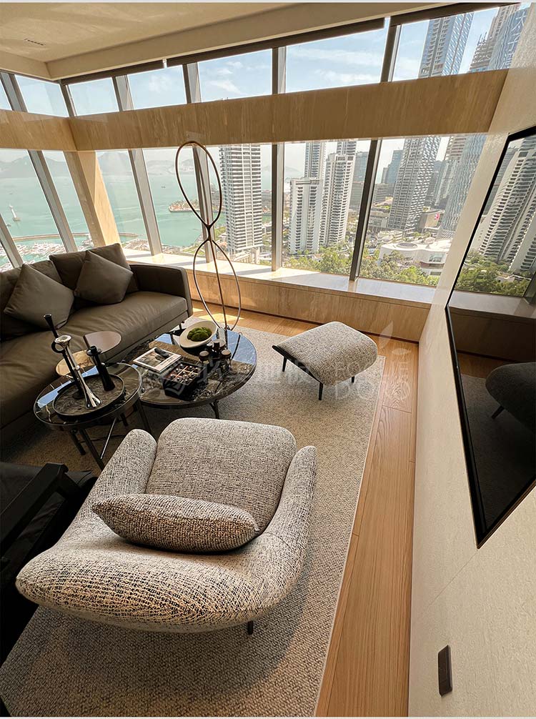 而整個別墅中最令人神往的空間,莫過于主臥套房。它占據了復式的最佳觀景位置,擁有一扇俯瞰180°深圳灣海景的巨幅落地窗。在這里,深圳灣的朝暉夕陰都成為了臥室的天然動態壁畫。為了與這無與倫比的景致相匹配,地面鋪裝的選擇必須達到“驚艷”的級別,精選了必美菲列德羅的巴塞吉奧橡木地板!