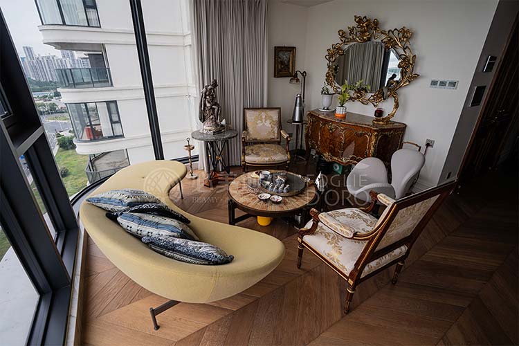 大面積鋪設必美菲列德羅薩利亞魚骨拼地板,精選煙熏工藝呈現出深淺不一的自然色彩,簡繁重疊,極具辨識度,從視覺上延伸整體的空間感,讓人陶醉在出乎意料的自然景色當中。