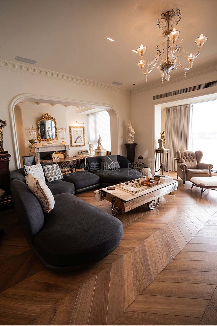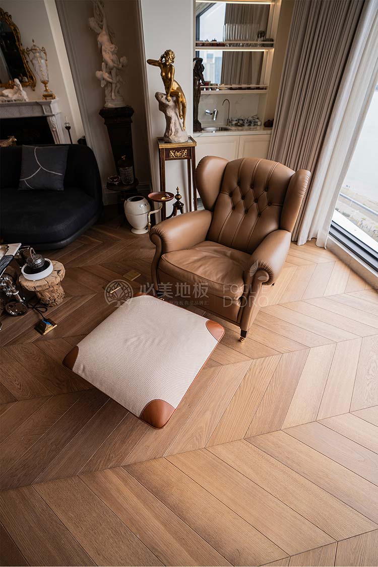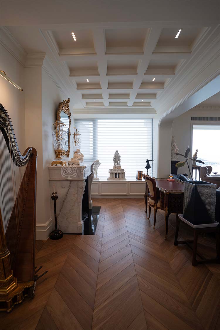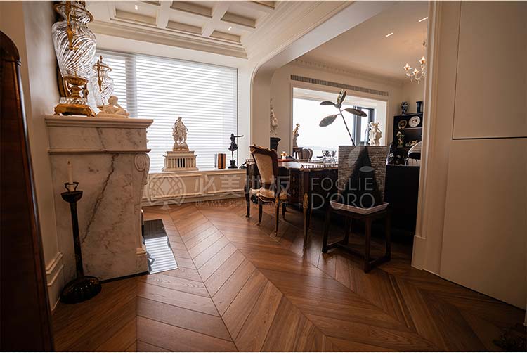 經典的魚骨拼接地板設計,如同律動的音符,在腳下綿延展開,不僅極大地提升了空間的縱深與立體感,更以其嚴謹、對稱的幾何美學,莊重而極具秩序感。