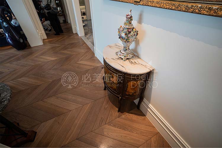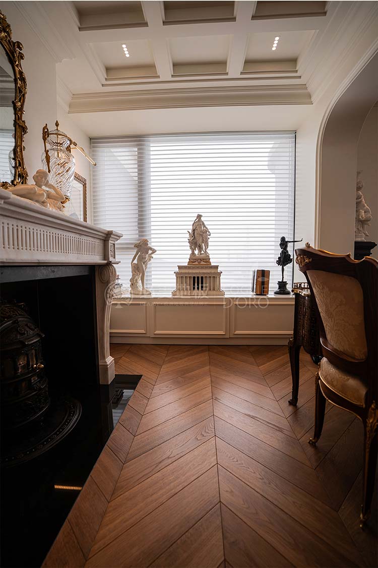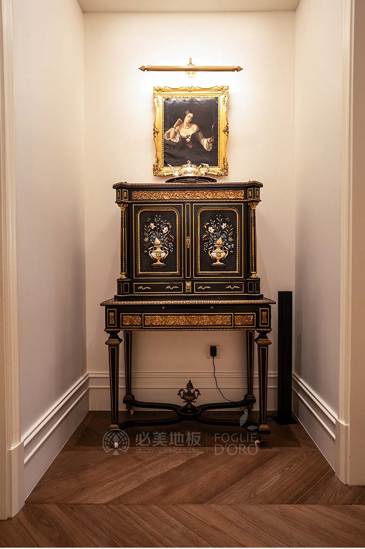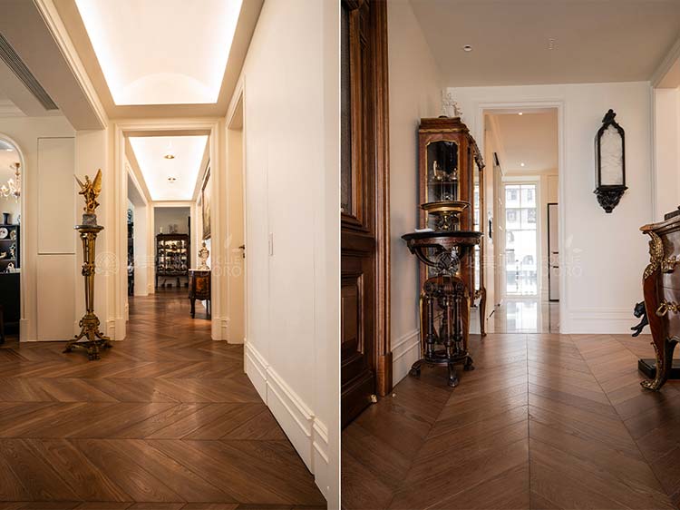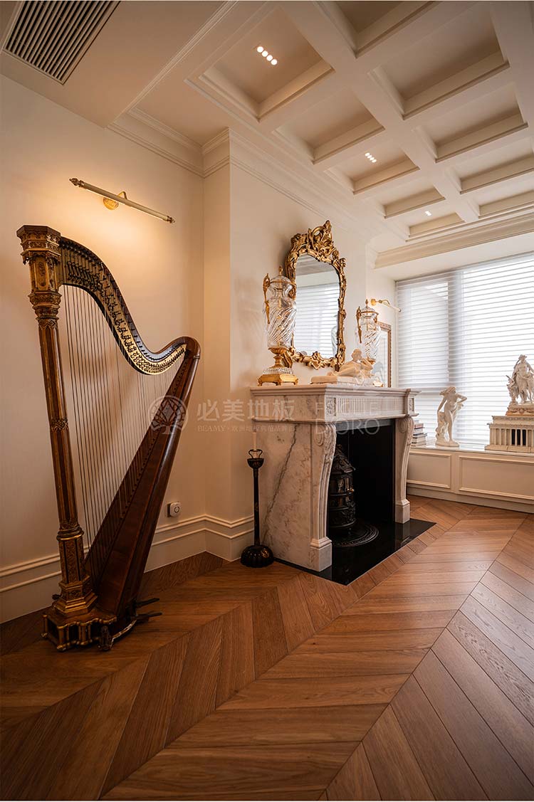 經典的魚骨拼接地板設計,如同律動的音符,在腳下綿延展開,不僅極大地提升了空間的縱深與立體感,更以其嚴謹、對稱的幾何美學,莊重而極具秩序感。