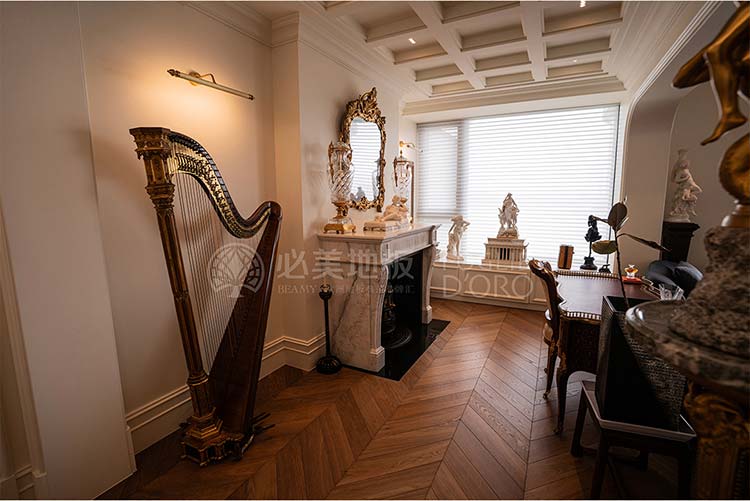 地面之上,空間的敘事層層展開。一架線條優美的古典豎琴靜立于旁,它不僅是視覺的焦點,更仿佛為空間注入了無聲的旋律,暗示著主人高雅的藝術品位;輕法式雕花家具以純熟的工藝與繁復精美的細節,彰顯著輕法式浪漫的儀式感。
