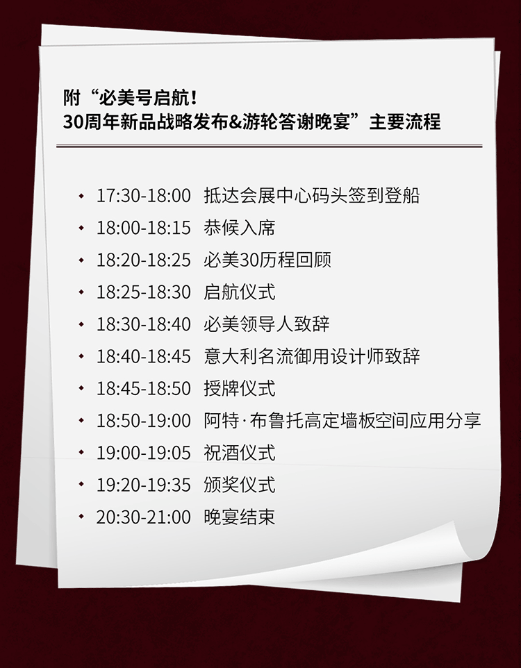 附“必美號啟航!30周年新品戰略發布&游輪答謝晚宴”主要流程