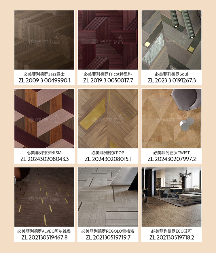 •設計藏著莊園故事:原創專利設計,每款原創拼花都有國際專利號,如同紋理還原賽馬沖刺時的飛揚塵土,踩上去仿佛能聽見貴族莊園的馬蹄聲